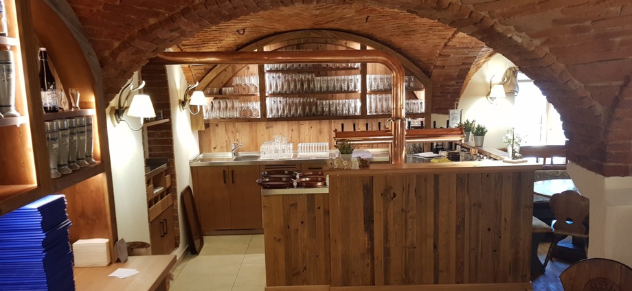 In urigem Gewölbe, an massiven Holztischen sitzend,